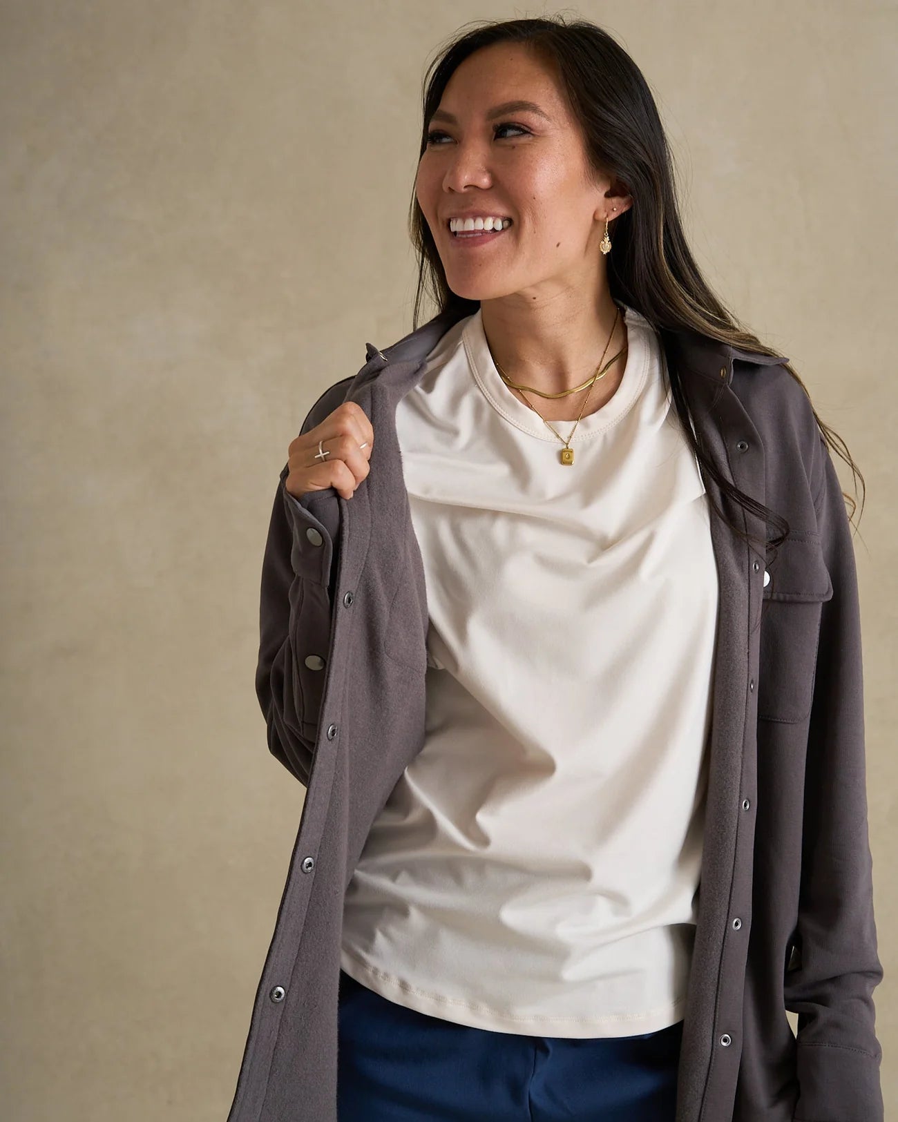 Adaptable style meets everyday comfort. This versatile overshirt bridges relaxed ease and polished professionalism with a curved hem, slightly tapered fit, and luxuriously soft TreeCell™ fabric—perfect for travel, layering, or workdays on the go.