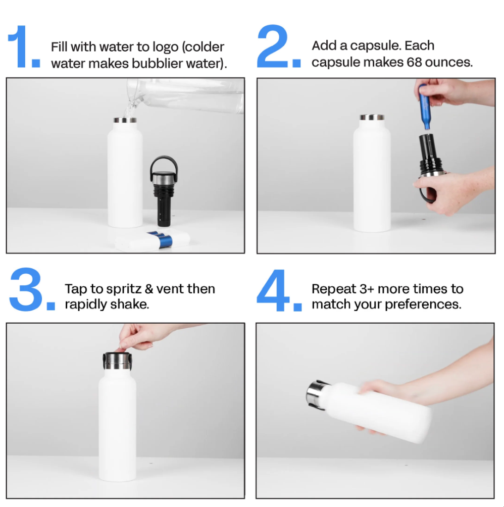 Creates sparkling water in 3 easy steps: fill, spritz, shake