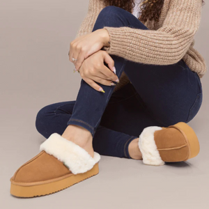 Step into cloud-like comfort with the Platform Scuff. Lined with plush sheepskin and set on a lightweight EVA sole, this elevated slipper blends cozy warmth with a modern lift.
