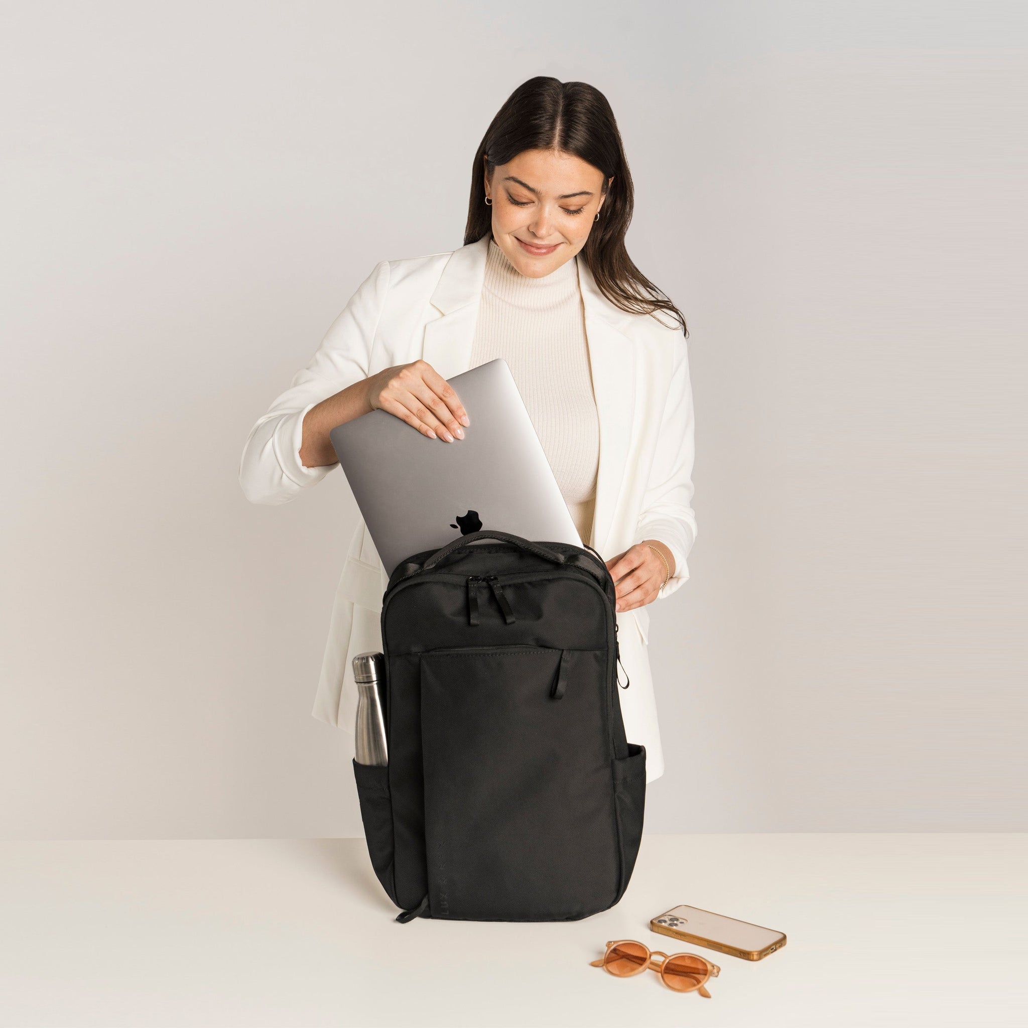 Sleek and smart, this 16-inch laptop backpack is inspired by mindful organization. A tech-friendly work backpack, thoughtfully designed with internal and external compartments, trolley sleeve, and a modern, elevated look.