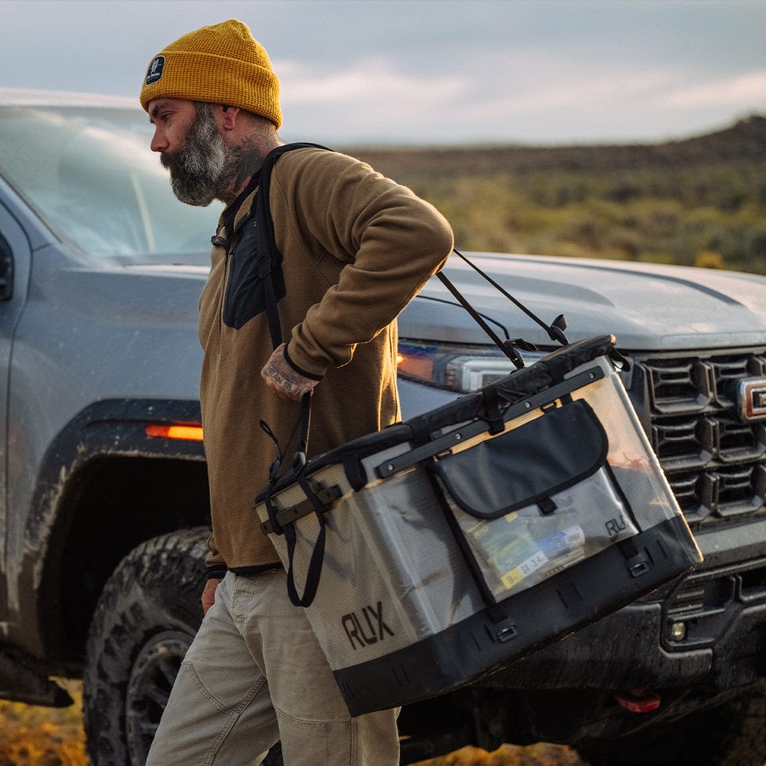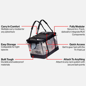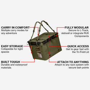 This soft-sided, weatherproof storage system functions like a gear box, carries like a tote or backpack, and collapses flat when not in use. Built for outdoor versatility, the 70L container features a wide, structured opening for easy packing, multiple carry modes, and compatibility with modular accessories for customizable organization.
